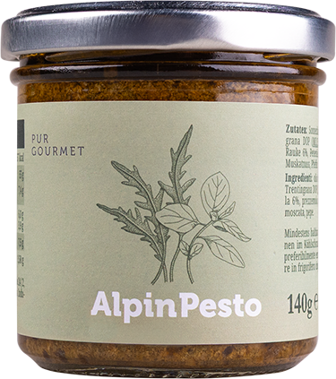 Das Pesto aus den Alpen – wiesenkräuterfrisch und wunderbar wildaromatisch. Kräftige grüne Würze liefern Basilikum, Rauke und Petersilie. Gemeinsam mit sonnengereiften Tomaten, würzigem Trentingrana und feinen Walnüssen entsteht ein vielseitiger Aufstrich mit alpinem Charakter. Ideal zu Pasta, als Brotaufstrich oder zum Verfeinern von Gerichten – frisch, kräftig, unverwechselbar im Geschmack. Alpenpesto – die würzige Kräuterkomposition mit mediterranem Twist.